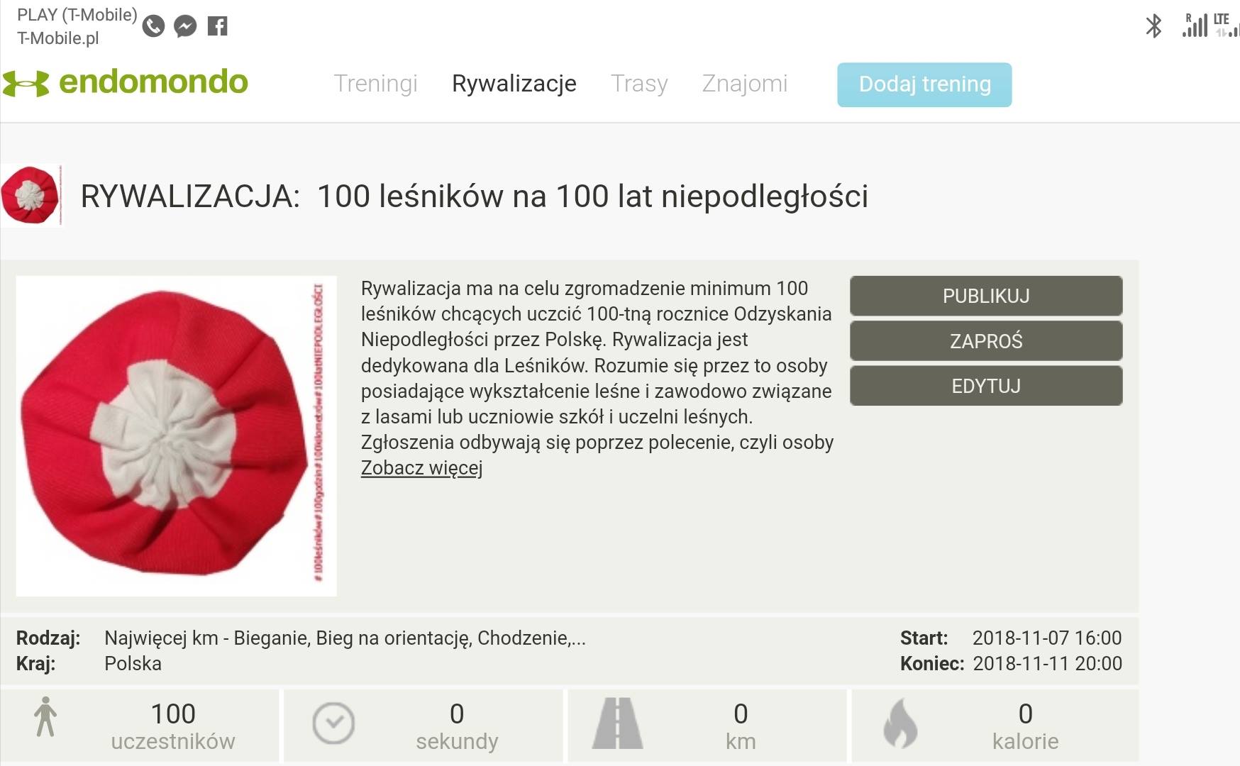 Leśnicy, minimum 100, w ciągu 100 godzin pokonają dystans 100 km, aby w ten aktywny sposób uczcić 100. rocznicę odzyskania niepodległości przez Polskę! Podczas aktywnosci należy odwiedzić co najmniej jedno miejsce związane z rocznicą odzyskania niepodległości przez Polskę. Należy również pamiętać o zrobieniu w takim miejscu zdjęcia.