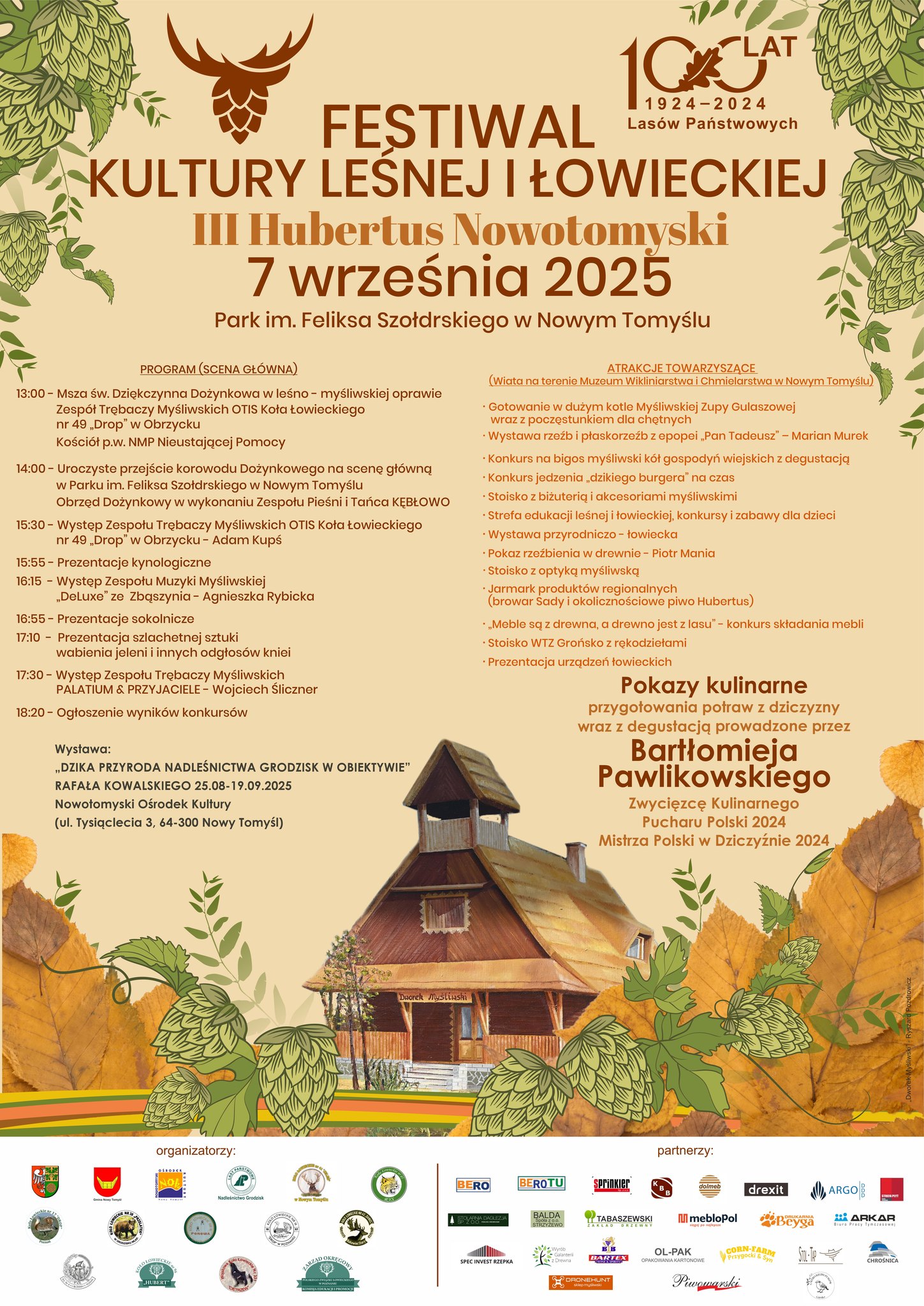 Nadleśnictwo Grodzisk wraz z Organizatorami Jarmarku Chmielo-Wikliniarskiego zaprasza na III Hubertusa Nowotomyskiego, który odbędzie się 7 września 2025 r. w Nowym Tomyślu.