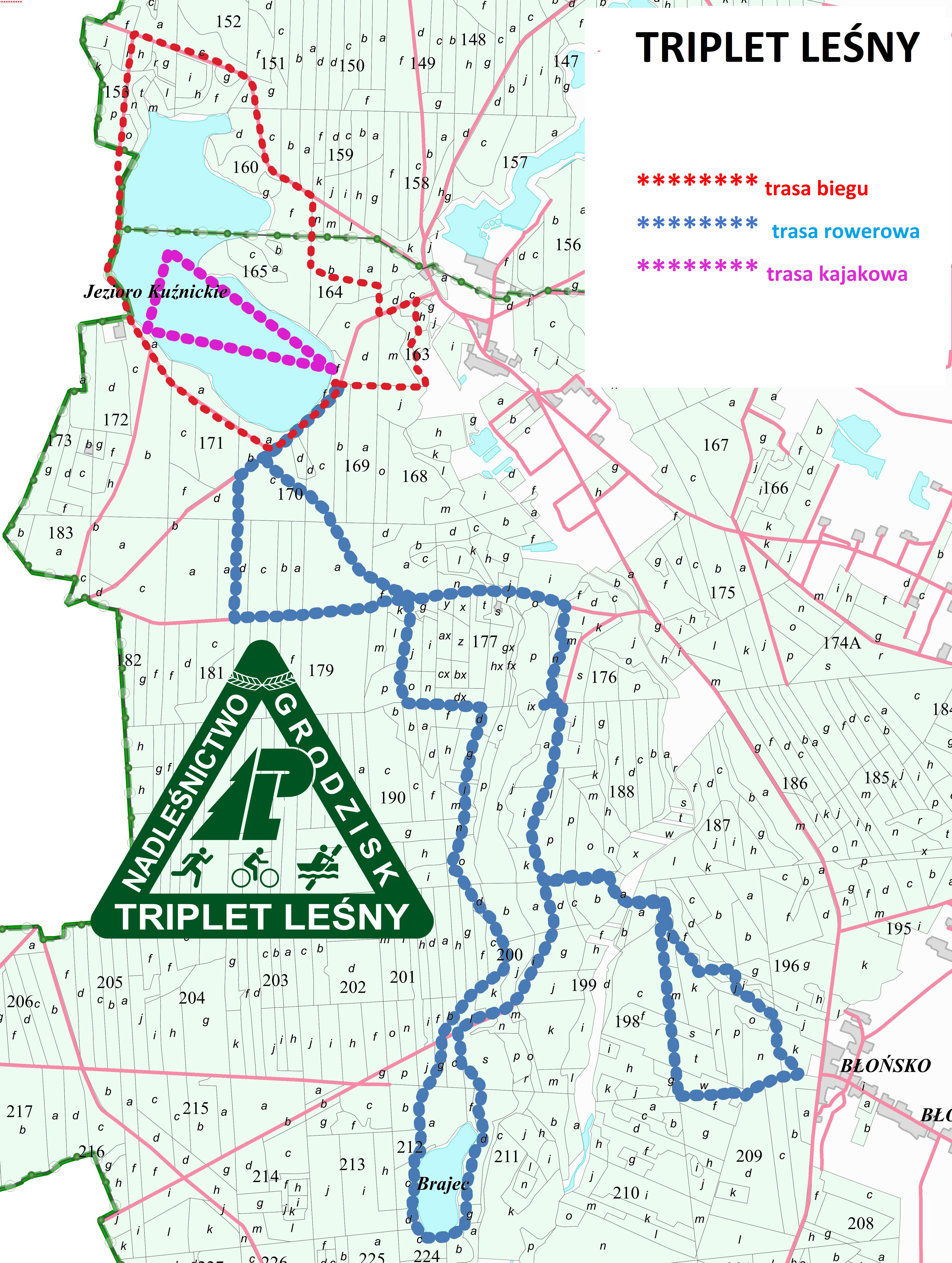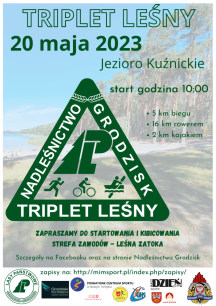 Nadleśnictwo Grodzisk zaprasza serdecznie do udziału w I Triplecie Leśnym, który odbędzie się 20 maja 2023 roku nad Jeziorem Kuźnickim. W ramach zawodów uczestnicy będą mieli do pokonania ok. 5 km trasę biegową, ok. 16 km trasę rowerową (obie leśnymi i gruntowymi drogami) oraz ok. 2 km kajakiem po jeziorze.